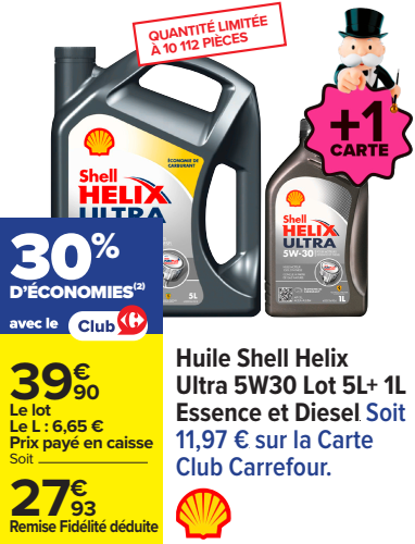 - Huile Shell Helix Ultra 5W30 (5L + 1L) — 39,90 € → 15,96 € (−60%)