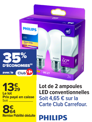 - Ampoules LED Philips (x2) — 13,29 € → 3,99 € (−70%)
