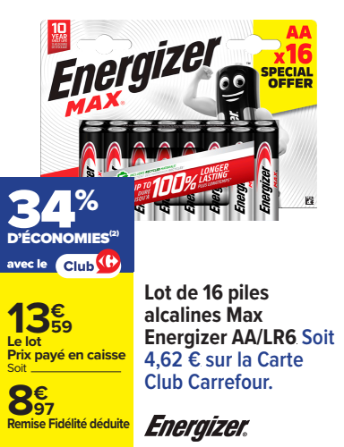 - Piles alcalines Energizer Max (x16) — 13,59 € → 4,35 € (−68%)