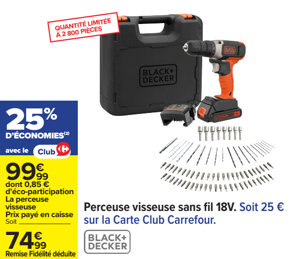 - Perceuse-visseuse 18 V — 99,99 € → 49,99 € (−50%)