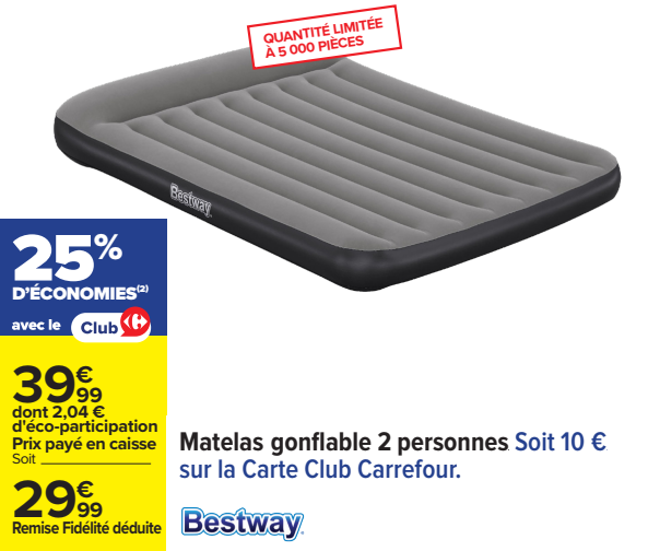 - Matelas gonflable 2 pers. Bestway — 39,99 € → 19,99 € (−50%)