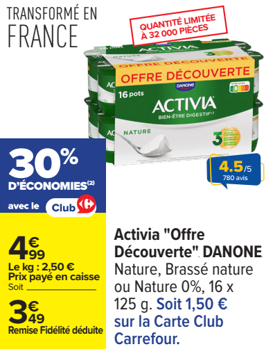 - Danone Activia 16×125 g (Offre découverte) — 4,99 € → 1,99 € (−60%)