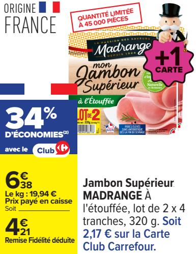 - Jambon Supérieur Madrange 320 g — 6,38 € → 2,04 € (−68%)