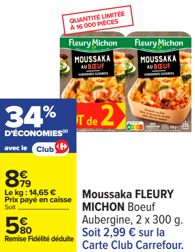- Moussaka Fleury Michon 2×300 g — 8,99 € → 3,01 € (−67%)