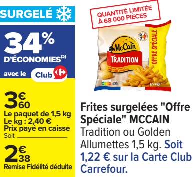 - Frites McCain 1,5 kg (Offre spéciale) — 3,60 € → 1,16 € (−68%)