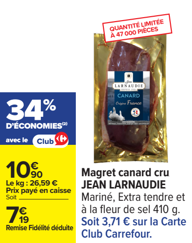 - Magret de canard cru Jean Larnaudie (env. 410 g) — 10,96 € → 3,54 € (−68%)