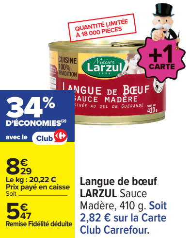 - Langue de bœuf Larzul sauce Madère 410 g — 8,29 € → 2,65 € (−68%)