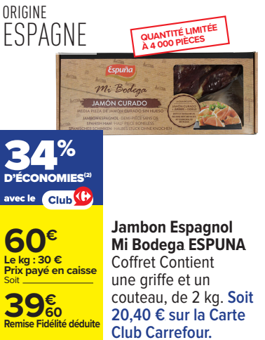 - Jambon Espagnol Mi Bodega Espuna + couteau (1 kg) — 60,00 € → 19,20 € (−68%)