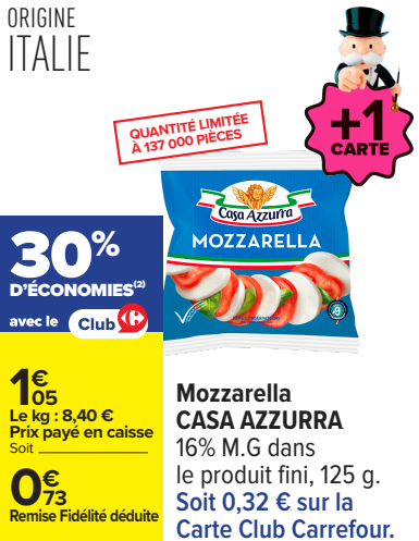 - Mozzarella Casa Azzurra 125 g — 1,05 € → 0,41 € (−61%)