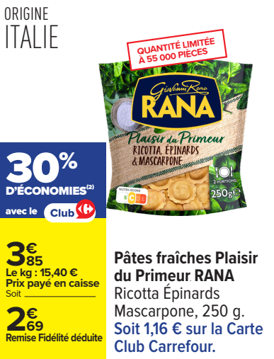 - Pâtes fraîches Rana 250 g — 3,85 € → 1,53 € (−60%)