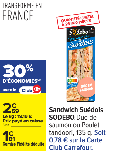 - Sandwich Suédois 135 g (Sodebo) — 2,59 € → 1,03 € (−60,2%)