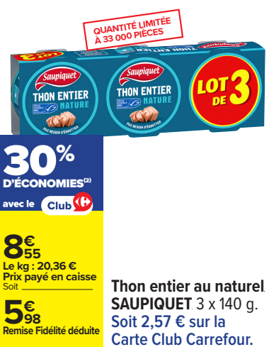 - Thon entier au naturel 3×140 g (Saupiquet) — 8,55 € → 3,41 € (−60,1%)