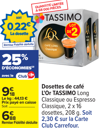 - Dosettes L’OR TASSIMO (2×16) — 6,80 € → 4.58 € (−50%)