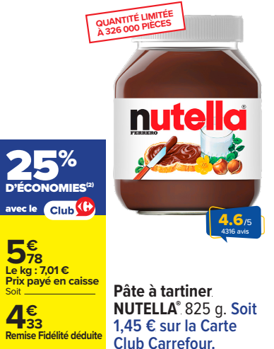 - Nutella 825 g — 5,80 € → 2,90 € (−50%)