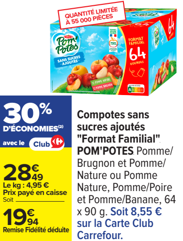 - Compotes Pom’Potes 64×90 g — 28,49 € → 11,39 € (−60%)