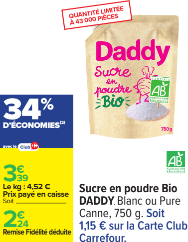 - Sucre en poudre Bio Daddy 750 g — 3,69 € → 1,09 € (−68%)