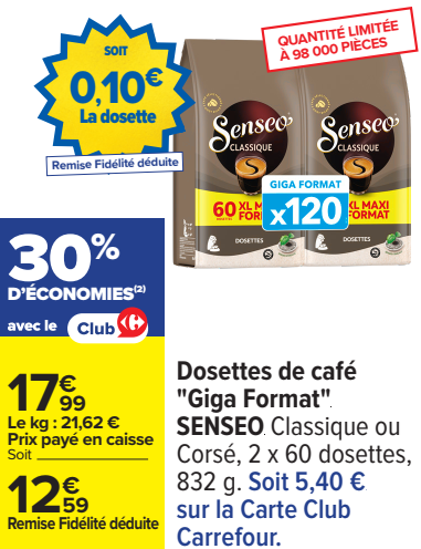 - Dosettes SENSEO Giga Format (2×60, 832 g) — 17,99 € → 7,19 € (−60%)