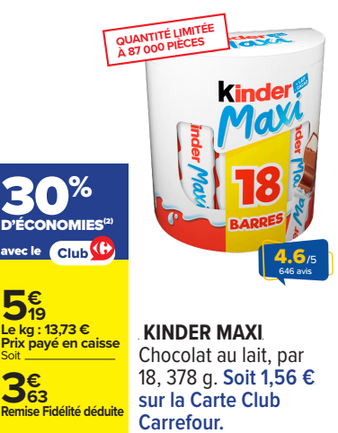 - Kinder Maxi (18 barres) — 5,39 € → 2,07 € (−60%)
