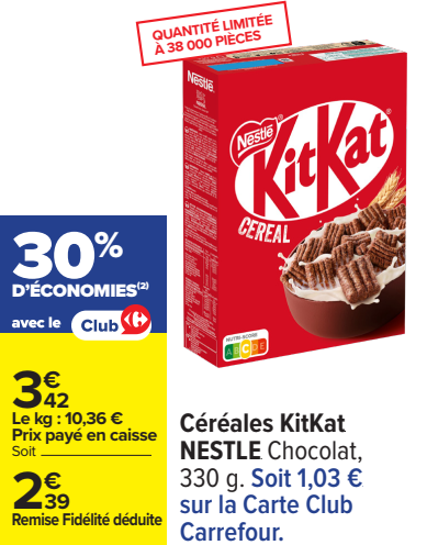 - Céréales KitKat Nestlé 330 g — 3,42 € → 1,36 € (−60%)