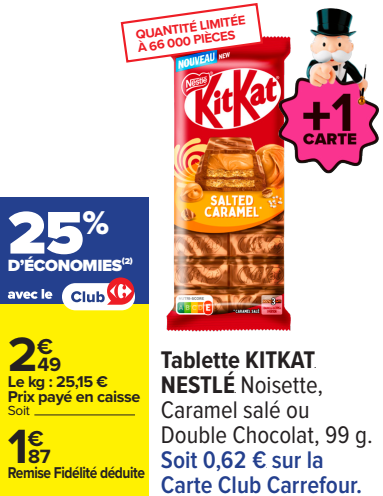 - Tablette KitKat Nestlé 99 g — 2,49 € → 1,25 € (−50%)