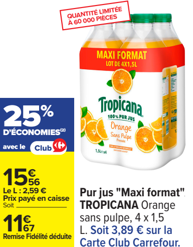 - Jus d’orange Tropicana Maxi Format (4×1,5 L) — 15,56 € → 7,78 € (−50%)