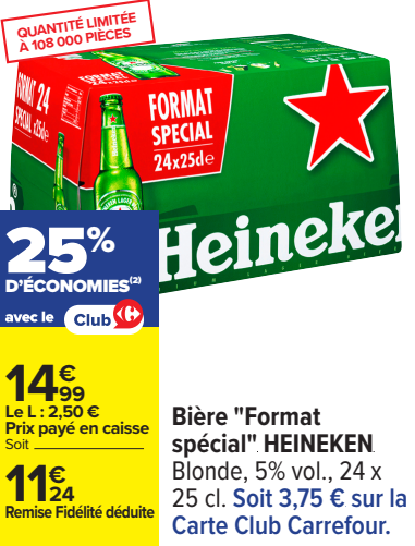- Bière Heineken (24×25 cl) — 14,00 € → 7,49 € (−50%)