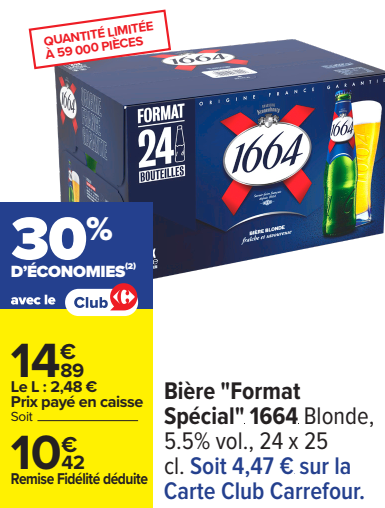 - Bière 1664 (24×25 cl) — 14,90 € → 5,95 € (−60%)
