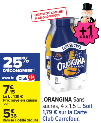 - Orangina sans sucres 4×1,15 L — 7,00 € → 3,00 € (−50%)