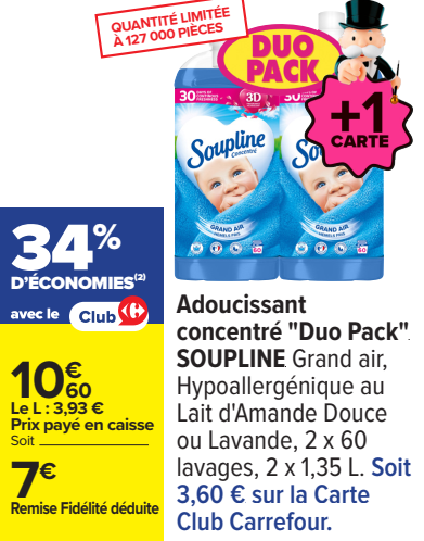 - Assouplissant Soupline Duo Pack (2×60 lavages) — 10,60 € → 3,40 € (−68%)