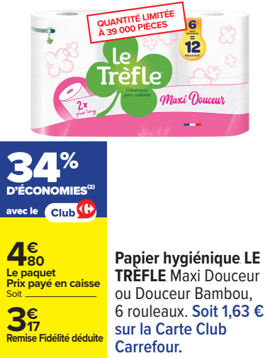 - Papier toilette Le Trèfle (6 rouleaux) — 4,80 € → 1,60 € (−68%)