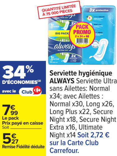 - Serviettes hygiéniques Always — 7,90 € → 2,70 € (−68%)