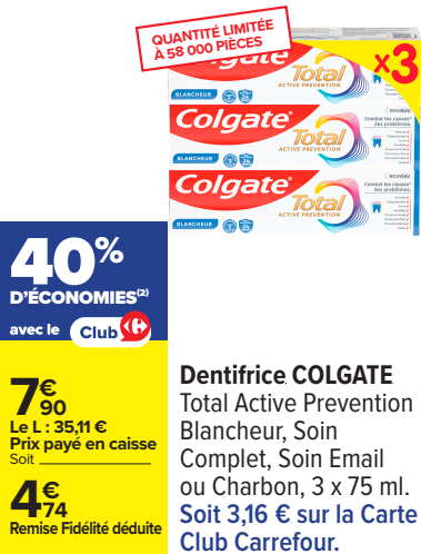 - Colgate 3×75 ml — 7,90 € → 1,50 € (−81%)