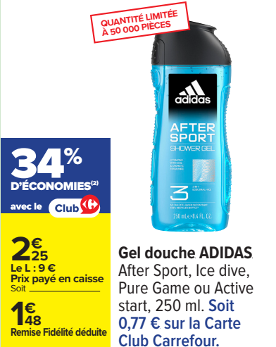 - Gel douche Adidas 250 ml — 2,25 € → 0,71 € (−68%)