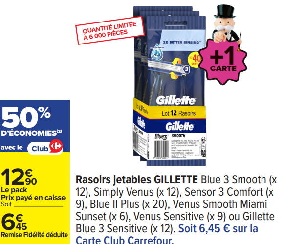 - Rasoirs jetables Gillette (Blue 3, Venus, Sensor, etc.) — 12,90 € → 6,45 € (−50%)