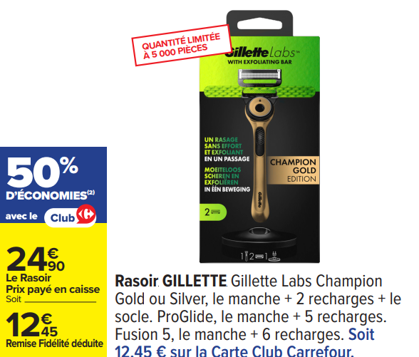 - Rasoir Gillette Labs / ProGlide / Fusion 5 — 24,90 € → 12,45 € (−50%)