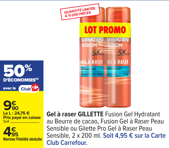 - Gel à raser Gillette Fusion (lot 2×200 ml) — 9,90 € → 4,95 € (−50%)