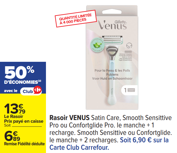- Rasoir Venus (Satin Care, Smooth Sensitive Pro, etc.) — 13,79 € → 6,90 € (−50%)