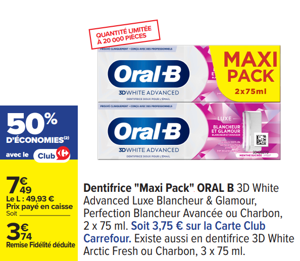 - Oral-B 3D White (2×75 ml) — 7,49 € → 3,75 € (−50%)