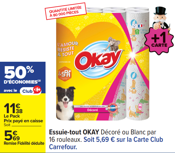 - Essuie-tout Okay (16 rouleaux) — 11,38 € → 5,69 € (−50%)