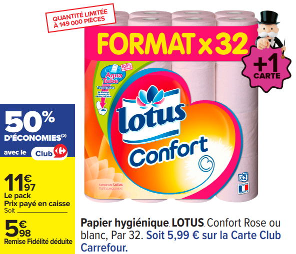 - Papier hygiénique Lotus Confort (32 rouleaux) — 11,97 € → 5,99 € (−50%)