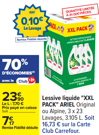 - Lessive Ariel XXL Pack — 23,90 € → 7,00 € (−70%)