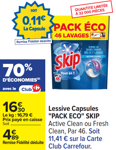 - Lessive Capsules Skip Eco (46 lavages) — 16,30 € → 4,89 € (−70%)