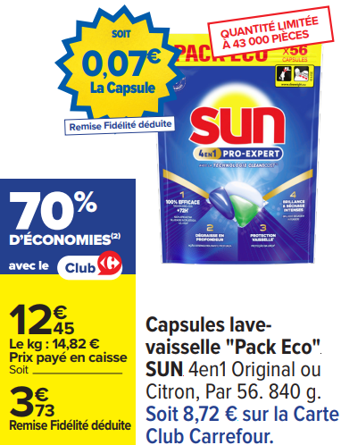- Sun Lave-vaisselle 4en1 (56 doses) — 12,25 € → 3,73 € (−70%)
