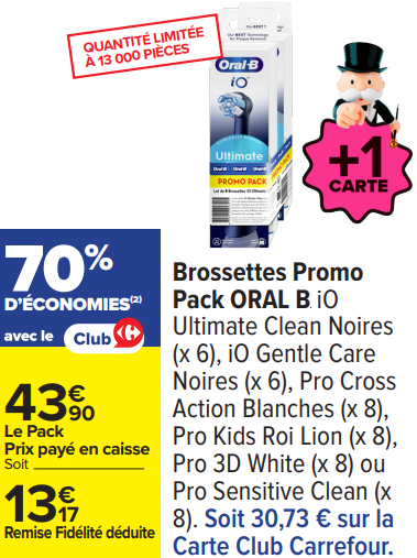 - Brossettes Oral-B iO (6 à 10 pcs) — 43,90 € → 13,00 € (−70%)