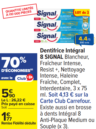 - Dentifrice Signal Intégral 8 (3×75 ml) — 5,90 € → 1,77 € (−70%)