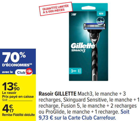 - Rasoir Gillette Mach3 / Fusion 5 / ProGlide (manche + recharges) — 13,90 € → 4,17 € (−70%)
