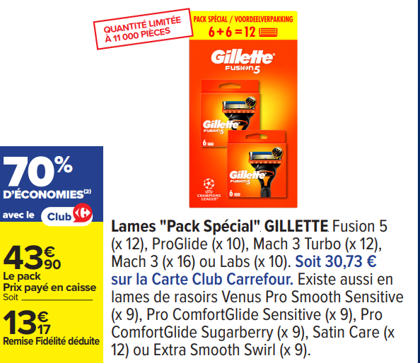 - Lames Gillette Pack Spécial (Fusion 5, ProGlide, Mach3, etc.) — 43,90 € → 13,00 € (−70%)