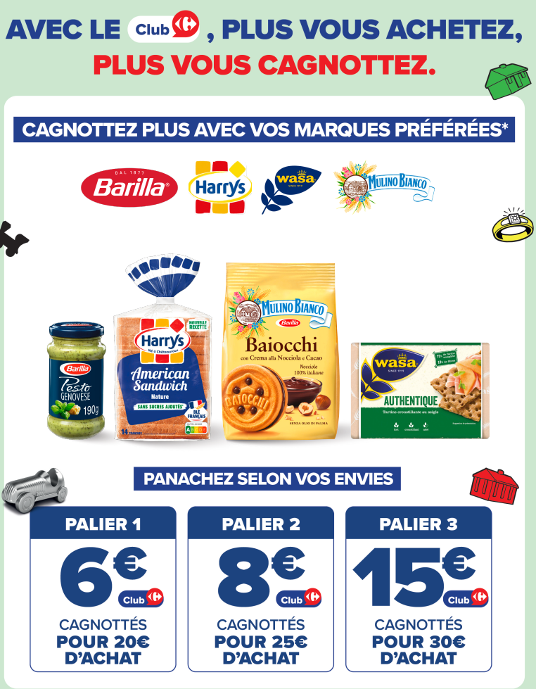 👉 Le deal ? Plus tu remplis ton panier avec des produits Barilla, Harry’s, Wasa ou Mulino Bianco, plus tu cagnottes. Et ça grimpe vite, comme un diplodocus affamé qui vide ton garde-manger. 🦕🍝