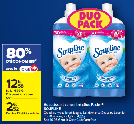 Deux gros flacons SOUPLINE, 120 lavages aussi, avec plusieurs parfums (Lavande, Grand Air, Hypoallergénique… bref, ça sent le propre 😌).