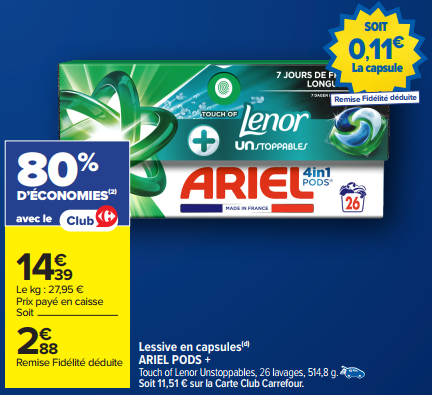 Des capsules Ariel PODS+, avec le petit bonus Lenor Unstoppables, et une capsule qui revient à… 0,11 € 😮